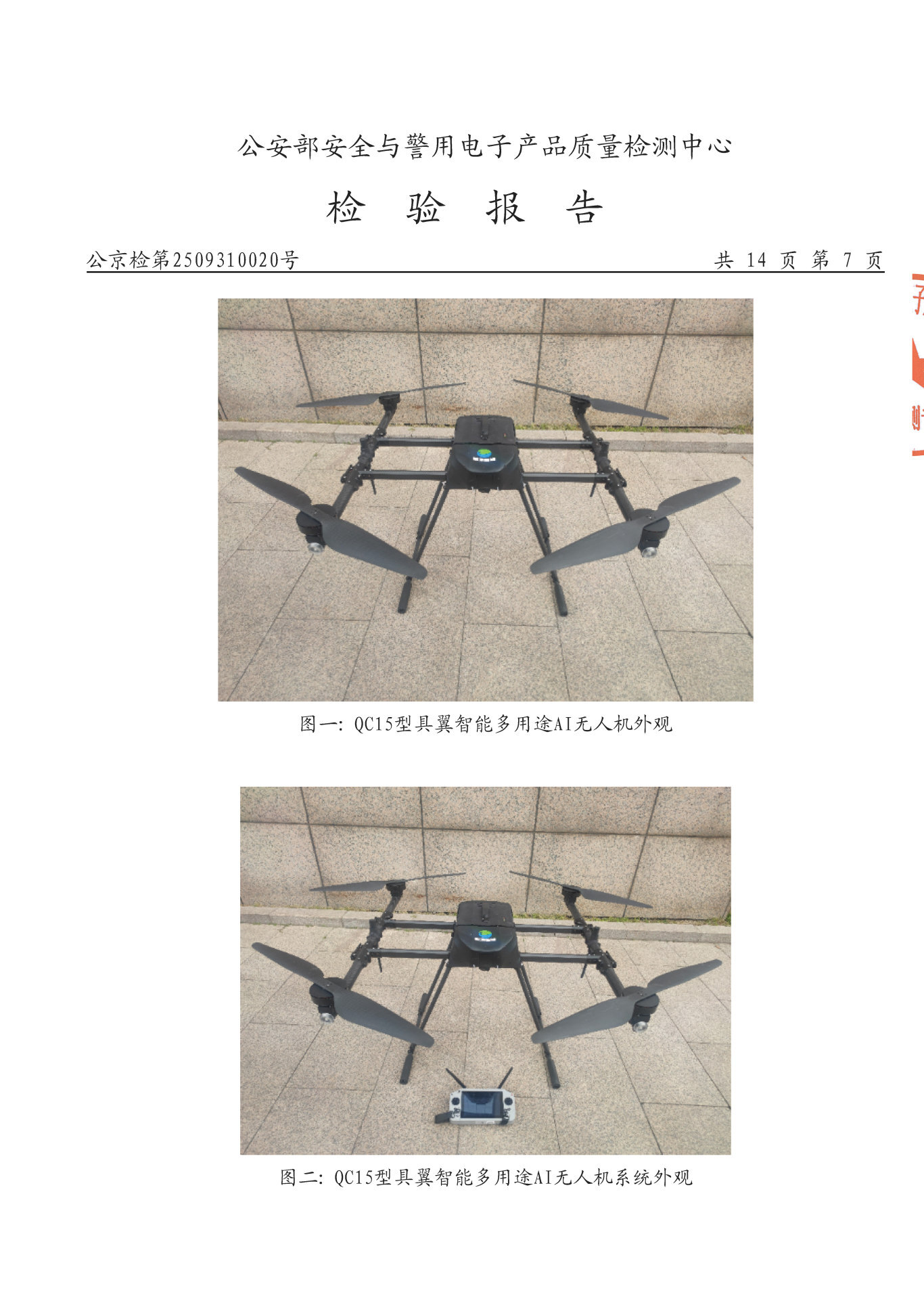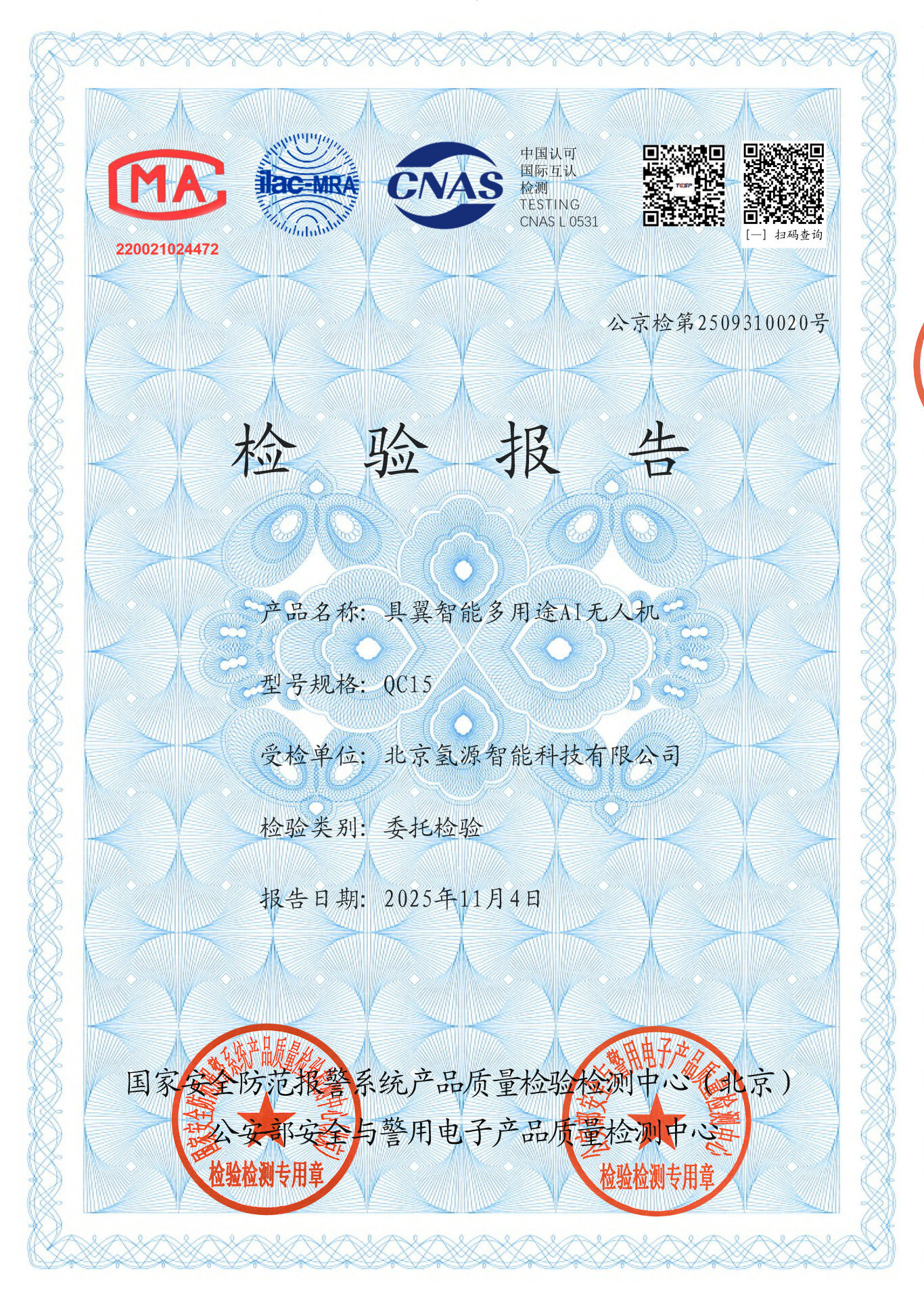 近日,北京氢源智能科技有限公司旗下具翼智能多用途AI无人机(型号:QC15)传来重磅喜讯——正式通过国家安全防范报警系统产品质量检测中心(北京)、公安部安全与警用电子产品质量检测中心双重严苛检测,成功获得权威检验报告!这标志着QC15无人机在安全性能、技术可靠性等核心维度完全符合国家公共安全行业标准,具备进入安防、警用等关键领域的“准入资质”,为低空经济高质量发展注入强劲动力。